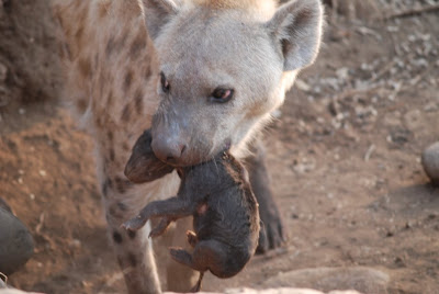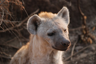 As probabilidades de numa viagem a Africa ficarmos ligados a um animal selvagem é capaz de ser de 1 para 1 milhão, mas aconteceu-me. Por mera casualidade do destino, o meu caminho cruzou-se com o de uma dócil hiena que me encantou pela confiança que demonstrou na nossa presença. Pessoalmente, nem tinha uma simpatia particular por hienas, atendendo ao patamar que ocupam na hierarquia da cadeia alimentar, mas, depois deste episódio, fiquei completamente rendida. Numa madrugada, em que saímos cedo para explorar a zona à volta do"Olifants Camp", passei por uma estrada de terra batida, numa zona bastante isolada. A determinada altura, pareceu-me ver um vulto deitado na berma da estrada. Via-se só a cabeça. Primeiro, ainda pensei que se tratava de um animal morto, pois não se mexia. Parei o carro. O corpo do animal estava metido debaixo da estrada, naquilo que percebi mais tarde ser um tubo de escoamento das águas da chuva. Parecia que respirava. Vi que se tratava de uma hiena. Estava no máximo a 2 metros de mim, imóvel, sem se perturbar com a minha presença. E depois, ouvi. Ouvi o barulho típico de crias recém nascidas, que, na realidade, nem era muito diferente do barulho que faziam as crias dos pastores-alemães que tive em criança. E esperei, em silêncio.A dada altura, a hiena levantou-se, olhou em redor. Estava tudo calmo. A minha presença pelos vistos não a incomodou. Julgo que o problema era mesmo a existência de predadores.Entrou na toca improvisada e... ...segurou em duas crias, recém nascidas e colocou-as perto de si. E as crias aninharam-se e dormiram em cima do dorso da mãe.Era delicioso ver a forma dócil como esta hiena tratava as crias, as protegia, zelava por elas e lhes dispensava toda a atenção que precisavam. Enquanto estive no "Olifants Camp", ao fim do dia, antes das 6h da tarde, hora limite para recolher aos acampamentos no Kruger, passava sempre por aqui. De todas as vezes que me aproximei com o carro ficou sempre imperturbável. Acho que nunca se sentiu ameaçada. No último dia olhou-me nos olhos, com um ar dócil, sem medo, e eu tirei esta fotografia. Mais tarde, perguntei a um guia no acampamento se era normal as hienas não recearem o homem. Confirmaram-me isso e mais, a toca feita por baixo da estrada destinava-se a procurar protecção junto dos seres humanos porque as hienas não os receiam. Deste modo, conseguia evitar os predadores, leões, chitas, leopardos e cães selvagens, porque estes receiam o homem e normalmente não se aproximam da estrada. Guardo com muita ternura esta minha passagem pelo Kruger e lembro-me muitas vezes deste episódio que me encantou.